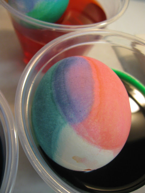 - Dye your eggs by letting them float in the different dye baths. Switch them out periodically and let the colors overlap.